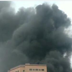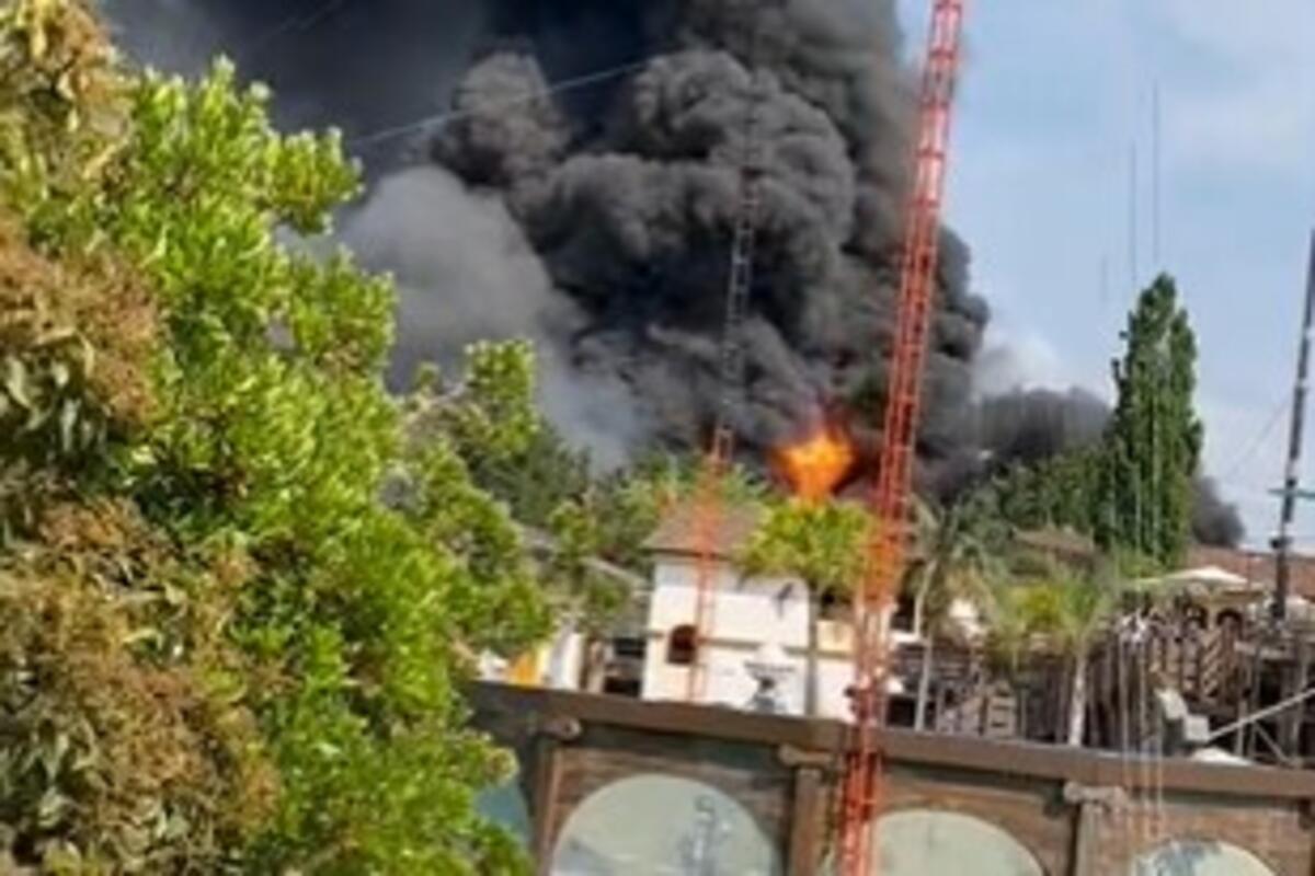 Video snimak prikazuje ogromnu pečurku crnog dima kako izbija iz unutrašnjosti zabavnog parka, dok šokirani posetioci stoje i gledaju plamen izdaleka.