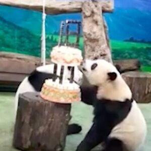 Kako se vidi na snimku koji je postao viralan pre nekoliko meseci, panda je stala na poveći panj pored drveta na koje je zakačen kanap sa džakovima.