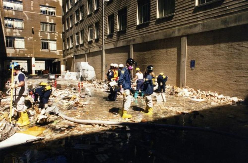Na fotografijama, koje je objavio FBI, mogu se videto policajci koji se pomaljaju iza zida, dok posmatraju horor koji su izazvali teroristi. Vide se i vatrogasci koji pokušavaju da ugase vatru koju je izazvao avion koji se zakucao u zgradu.