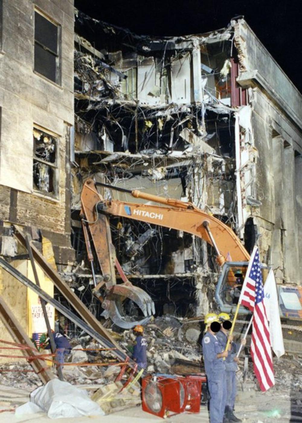 U velikoj gomili krša, jasno se vide neki delovi aviona koji je udario u zgradu. Na jednom delu se vidi napisano slovo "C".