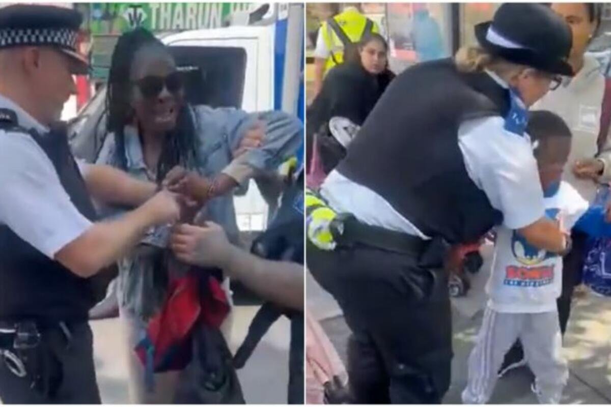 Na snimku se vidi policajac kako se saginje da razgovara sa ženinim sinom, dok ona pokušava da se oslobodi policije i viče.
