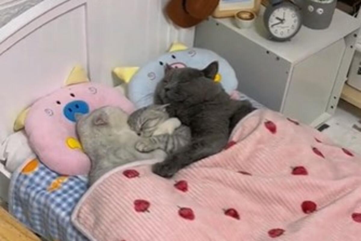 Snimak mame mace, tate mačka i njihove bebe dok zagrljeni zajedno spavaju na krevetiću oduševio je internet, prenosi Index.hr.