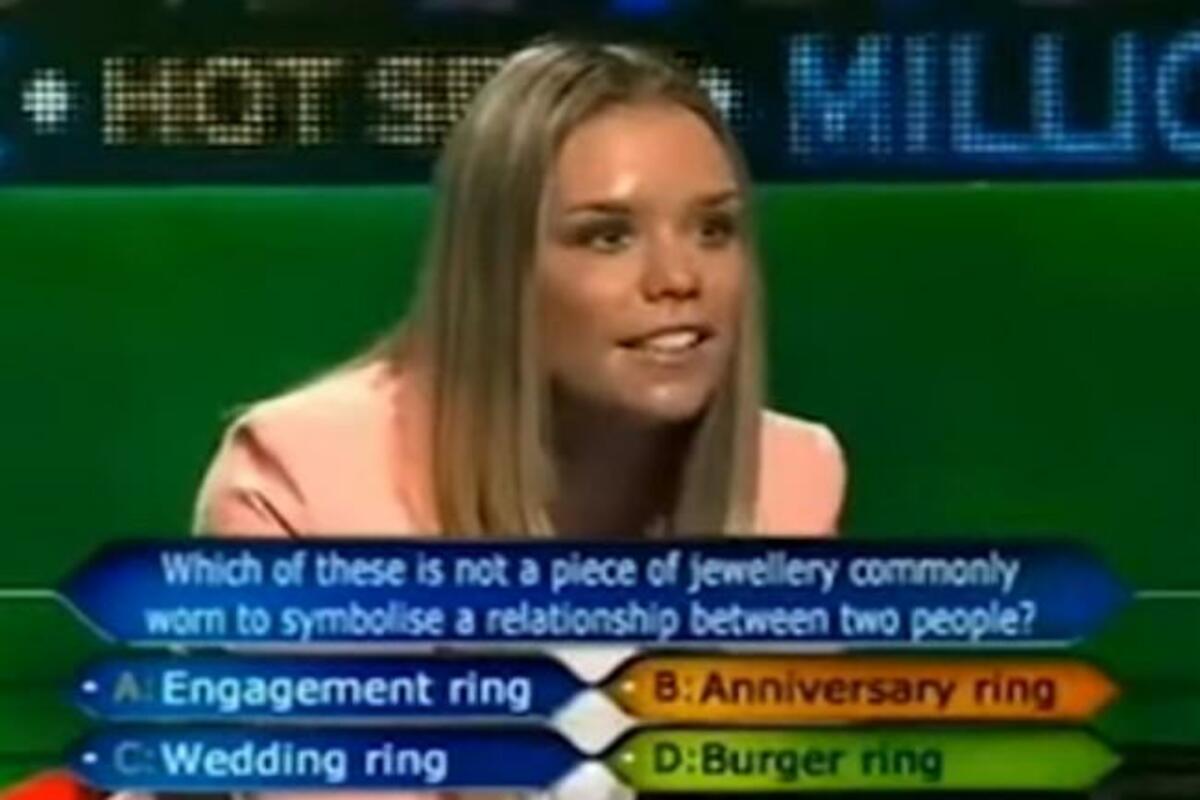 Ponuđeni odgovori bili su verenički prsten, prsten za godišnjicu ili burger kolutić. Plavuša se dugo preispitivala a onda je rekla prsten za godišnjicu.