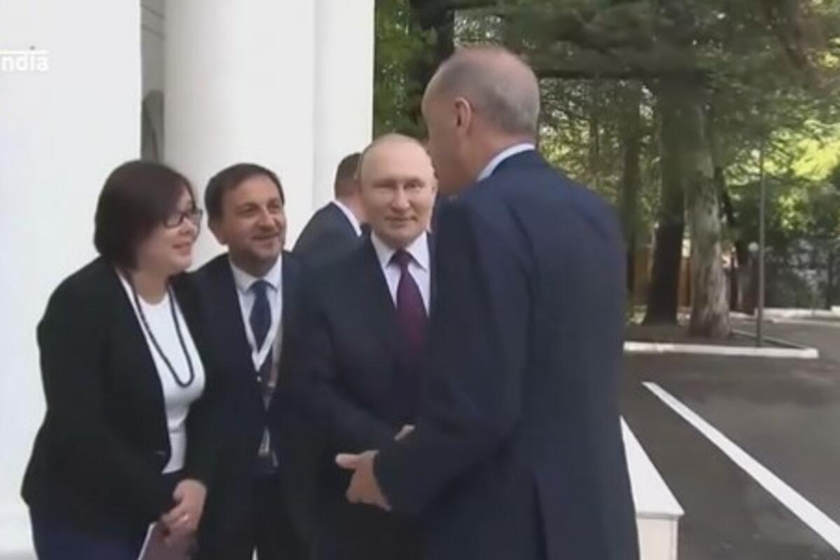 Na snimku RT objavljenom na druptvenim mrežama vidi se da je Putin dočekao Erdogana ispred rezoidencije, nakon čega su se rukovali i ušli unutra