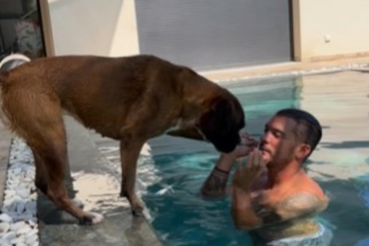 Bokser liče po licu vlasnika i pokušava da ga prednjim obuhvati šapicama oko vrata dok se zadnjim nogama jedva drži na samoj ivici bazena. Toliko je srećan da maše repom i na kraju je upao u bazen kod svog gazde.