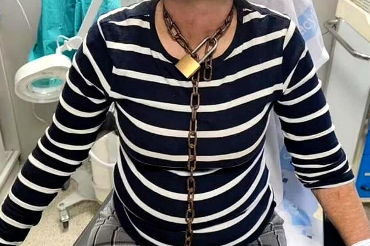 Oko vrata i ruku ženi je bio zaključan lanac sa dva katanca, a medicinskom osoblju je objasnila da je pobegla od kidnapera.