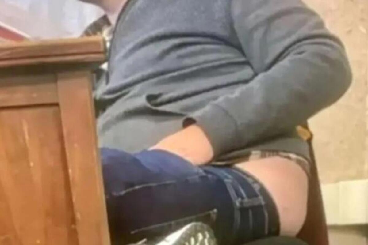 Učenici su uspeli da naprave fotografiju na kojoj se vidi nastavnik za stolom sa velikim delom zadnjice koji viri iz pantalona i desnom rukom uvučenom u prednji džep, prenosi Njujork post.