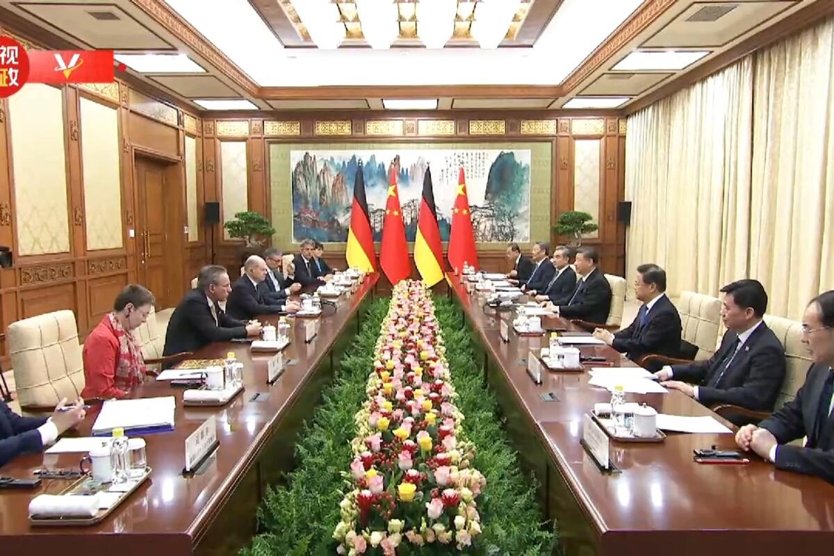Si je izjavio da se ove godine navršava 10. godišnjica od uspostavljanja sveobuhvatnog strateškog partnerstva između Kine i Nemačke. U proteklih 10 godina, uprkos velikim promenama međunarodne situacije, odnosi Kine i Nemačke su se uvek stabilno razvijali, a saradnja u različitim oblastima je produbljena, što je pružilo pogon razvoju bilateralnih odnosa. Kina i Nemačka su druga i treća svetska ekonomija, pa će jačanje i razvoj kinesko-nemačkih odnosa uticati na azijsko-evropski kontinent i ceo svet. Dve zemlje treba da razmatraju i razvijaju bilateralne odnose iz dugoročne i strateške perspektive, kako bi zajedno unele više stabilnosti i sigurnosti u svet. Si je istakao da između Kine i Nemačke ne postoji fundamentalni sukob interesa i da ne predstavljaju bezbednosnu pretnju jedna drugoj. Kinesko-nemačka saradnja je korisna za obe strane i za svet. S obzirom na svetsku turbulenciju, dve strane moraju više da pojačaju otpornost i vitalnost bilateralnih odnosa, insistiraju na glavnom tonu saradnje i opštem pravcu razvoja kinesko-nemačkih odnosa kao i da učvrste poziciju sveobuhvatnog strateškog partnerstva dve zemlje. Kineska politika prema Nemačkoj održaće visok stepen stabilnosti i doslednosti.