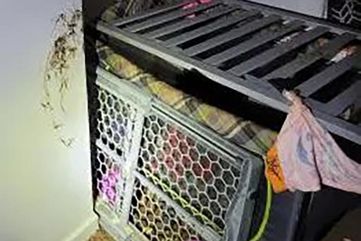 Policija je podelila fotografiju malog kaveza, na kojoj se vide komadi sivog krevetića koji su vezani zajedno u jedno. Otpad i fekalije su bile razbacane po kavezu, navodi se u policijskom izveštaju, u kojem se dodaje da su fekalije razmazane i po zidu pored njega.