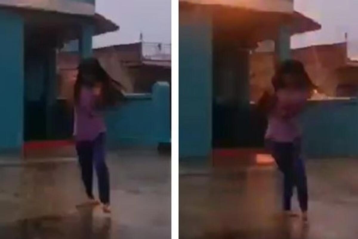 Ne znamo koji razlog je devojka imala da usred nevremena izađe napolje i zaigra, ali je imala puno sreće.
