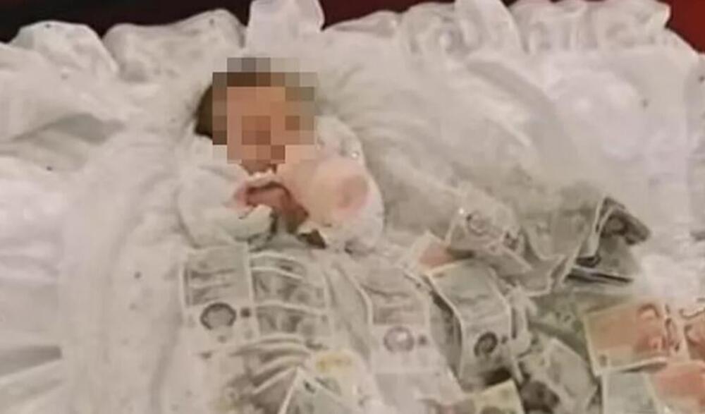 U jednom trenutku, okupljeni su bebu obasuli novčanicama, ostavljajući ih preko njene bele odeće kao simbol sreće i blagostanja.