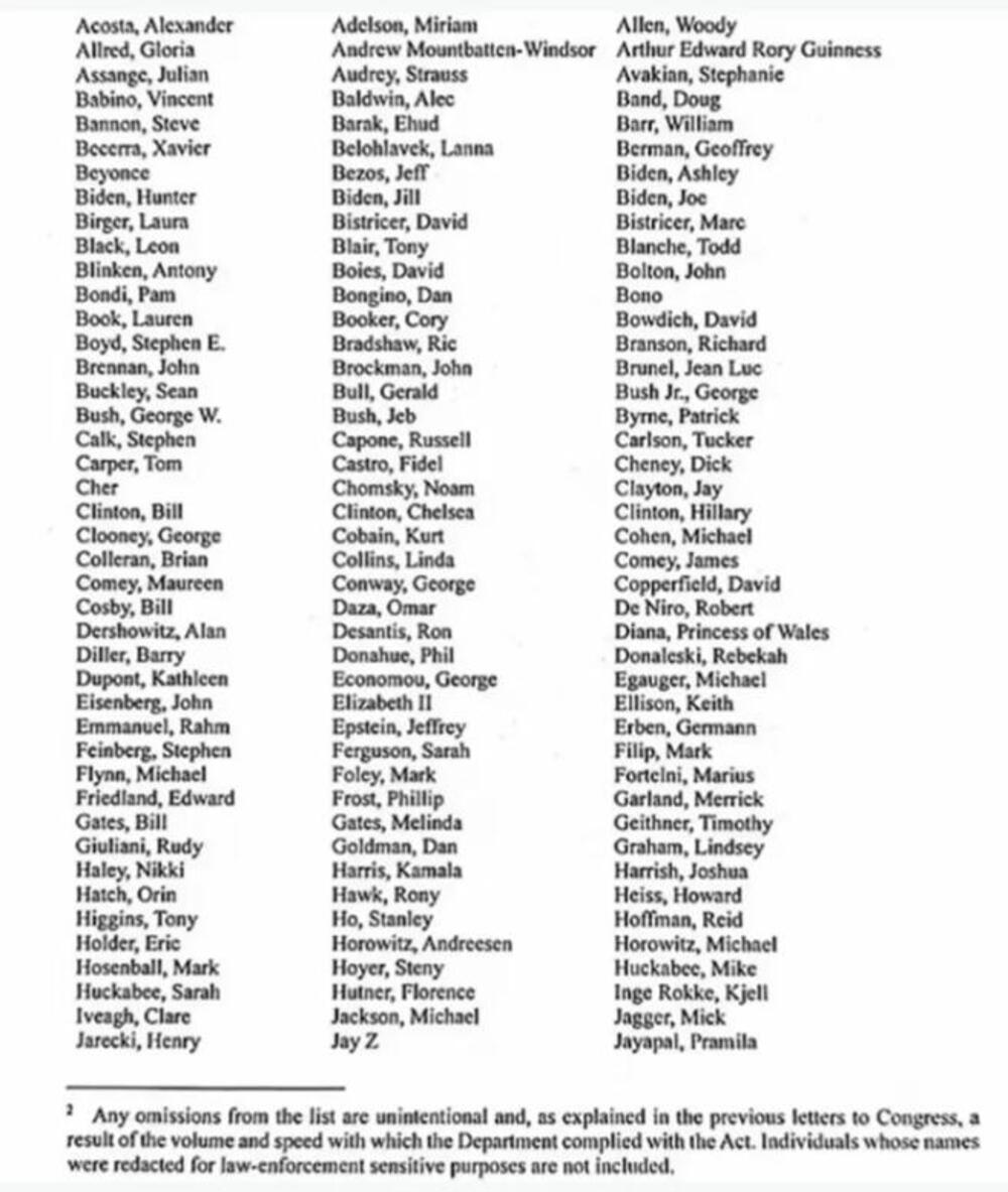 Objavljen je spisak koji sadrži stotine poznatih ličnosti, pevača, glumaca, političara i drugih javnih ličnosti koje se pojavljuju u Epstajnovim dokumentima. Ovo se desilo pošto je američka ministarka pravde Pam Bondi objavila da su svi dokumenti - koji obuhvataju milione mejlova, fotografija i pisama - sada dostupni javnosti.