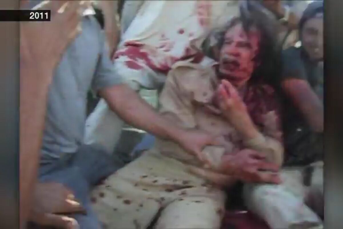 Na snimku se vidi pretučeni Gadafi dok sedi u prikolici vozila grupe boraca libijske opozicije. Takođe, prikazan je i zlatni pištolj koji drži jedan mlad čovek, a Gadafi se od tog pištolja nikada nije odvajao.