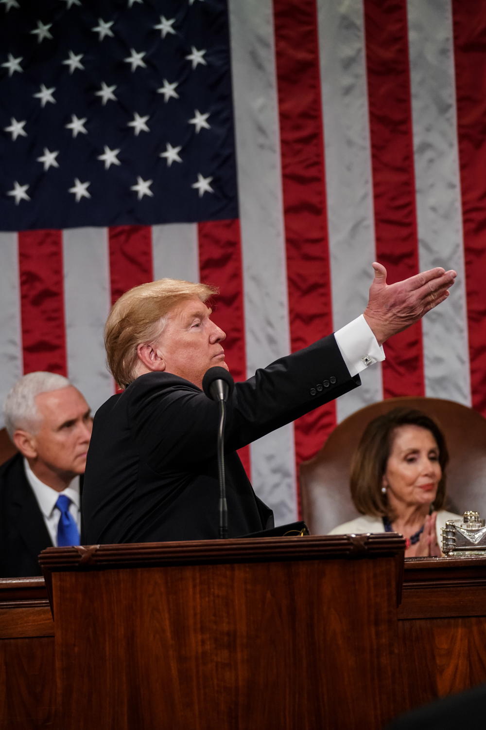 On je delegate, republikance i demokrate, pozvao da postignu kompromis oko pitanja imigracije. "Zidovi deluju i zidovi spašavaju živote. Stoga hajdemo da sarađujemo, postignemo kompromis i postignemo sporazum koji će učiniti Ameriku sigurnom", pozvao je i rekao da se više ne zalaže za zid duž cele granice, nego samo na područjima na kojima je potreban prema oceni granične policije.