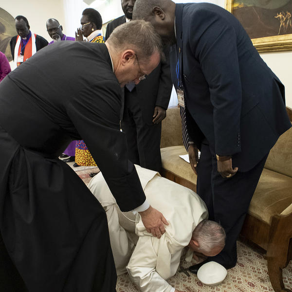 Kako prenosi britanska agencija, na zaprepašćenje južnosudanskih lidera 82-godišnji papa, kleknuo je uz pomoć svojih saradnika kako bi poljubio cipele dva glavna protivnika i nekoliko drugih ljudi u sobi.