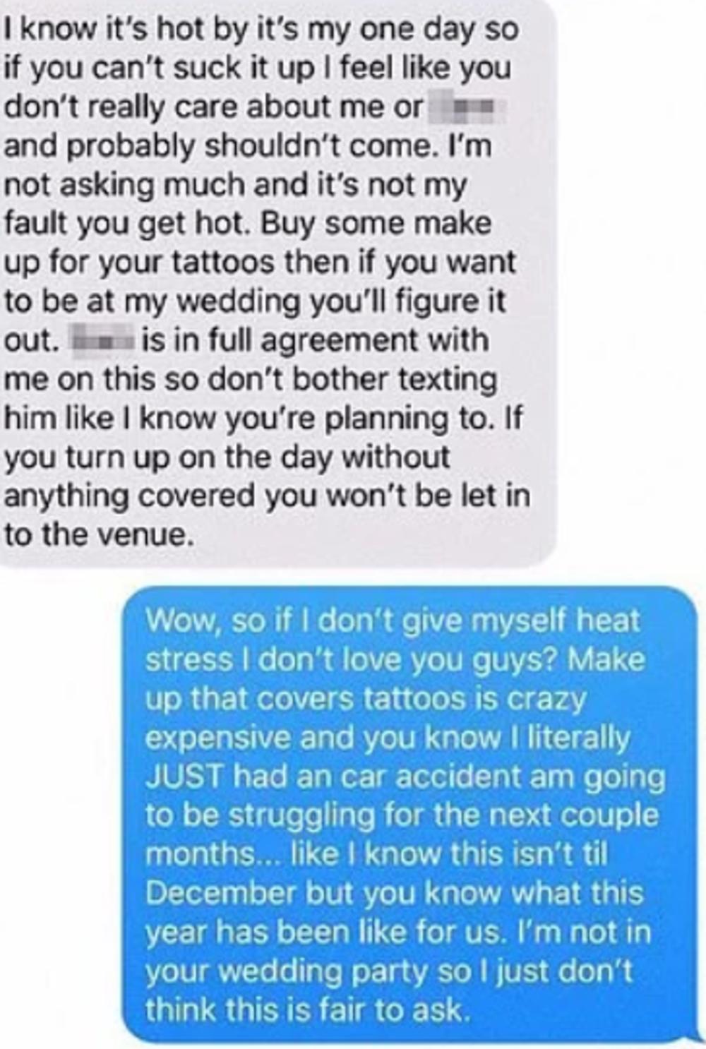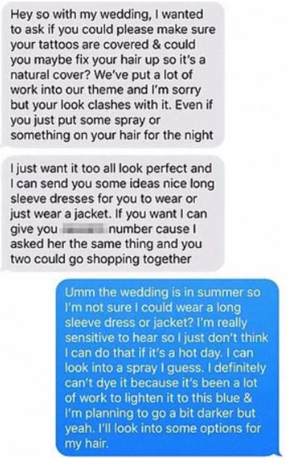 Gošća joj je odgovorila da sigurno neće nositi jaknu i duge rukave na toplom danu i da ne može da menja boju zbog njenog venčanja jer joj je dugo trebalo da dostigne tu nijansu.