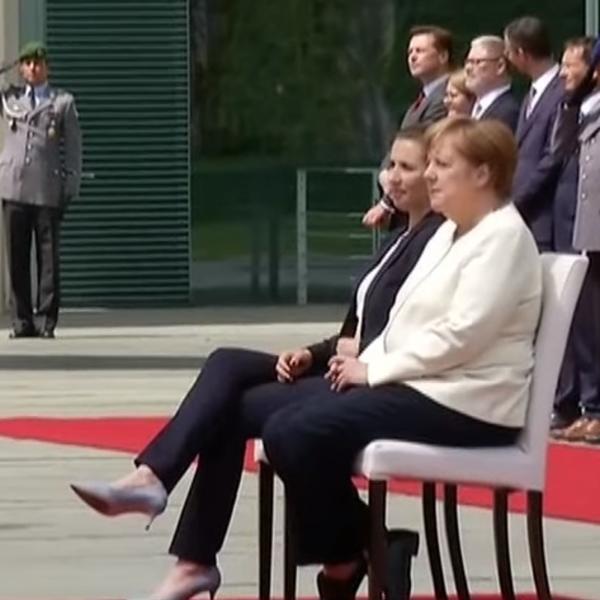 Merkel je prvi put viđena kako se trese dok se sastajala s ukrajinskim predsednikom Volodimirom Zelenskim - što je pripisala dehidraciji. Dana 27. juna, 64-godišnja kancelarkina ruka i telo su primetno drhtali dok je stajala iza nemačkog predsednika, Frank-Valtera Štajnmajera. Oko dva minuta, ona je neprestano preklapala ruke u očiglednom pokušaju da zaustavi ruke i telo od žestokog drhtanja. To se desilo samo nekoliko sati pre nego što je trebalo da se ukrca na avion do samita G20 u Japanu, što je izazvalo nova pitanja o njenom zdravlju.