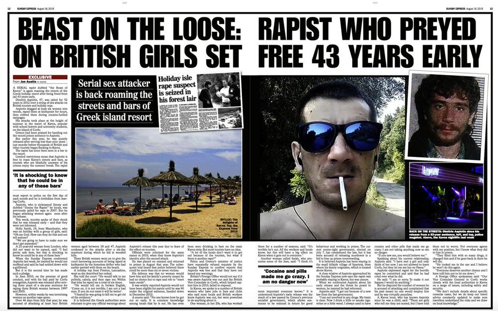 Devojka koja je pre osam godina doživela traumu kada ju je u Grčkoj silovao muškarac koji je vrebao Britanke u popularnom turističkom letovalištu na Krfu, užasnuta je što je "Zver iz Kavosa" puštena iz zatvora 45 godina ranije i što mu je dozvoljeno da se vrati u poznato ljetovalište.