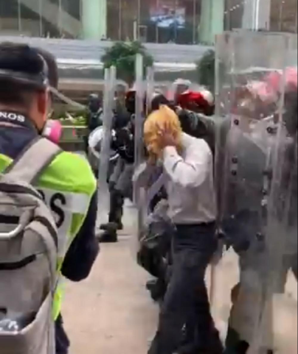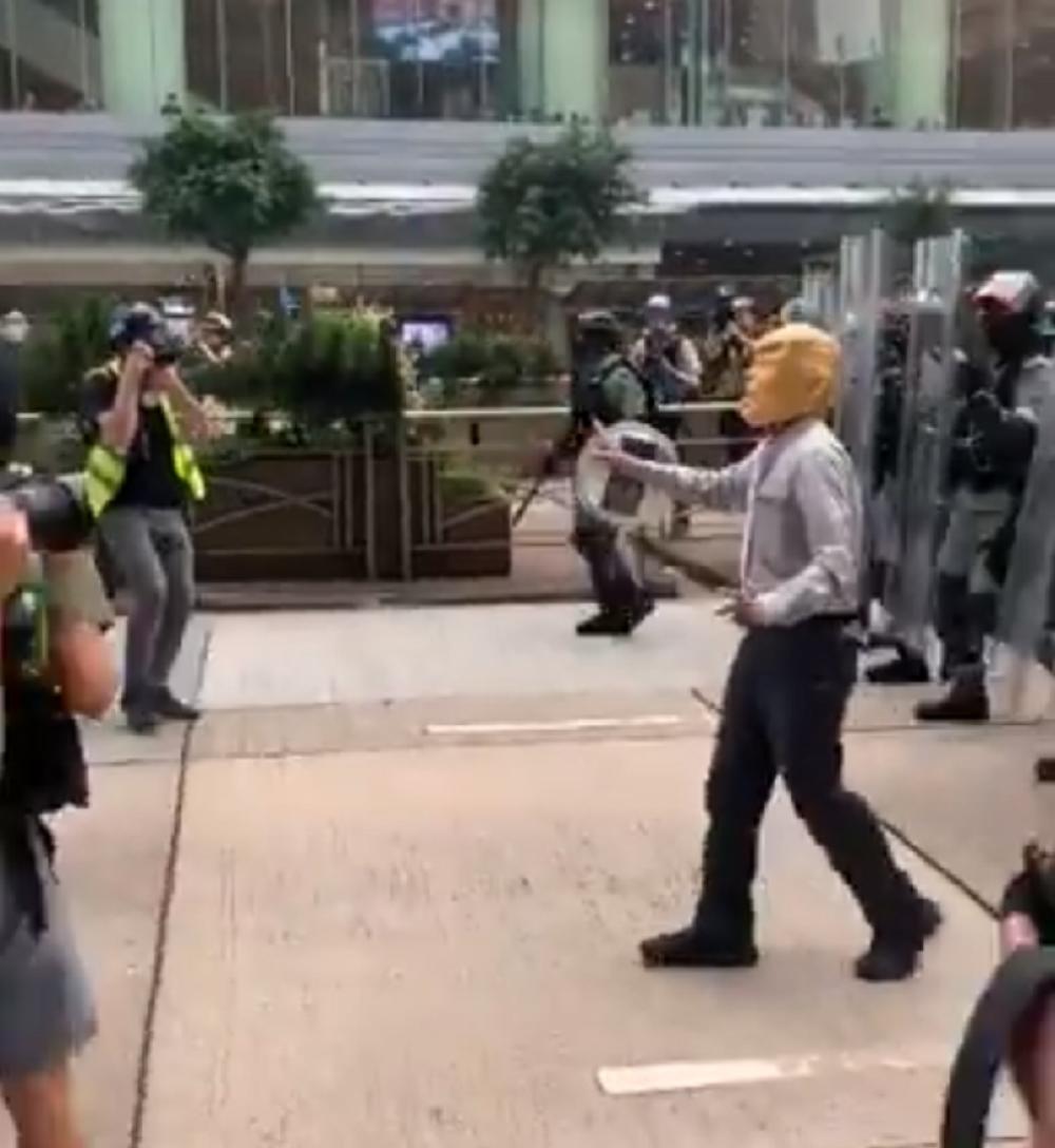 U trenutku kad je policija krenula u akciju, krenuo je da usporeno hoda ispred policijskog kordona. U jednom trenutku policajci su ga štitovima gurali, a onda uhvatili za glavu i uvukli ga unutar kordona gdje se i nije baš dobro proveo.