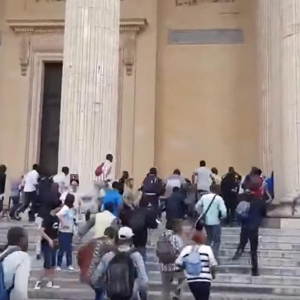 Dok je jedan od demonstranata šutnuo putnike koji su ga sprečili da se popne na voz, muškarac je uspeo da zgrabi aktivistkinju za nogu i privuče je na zemlju.