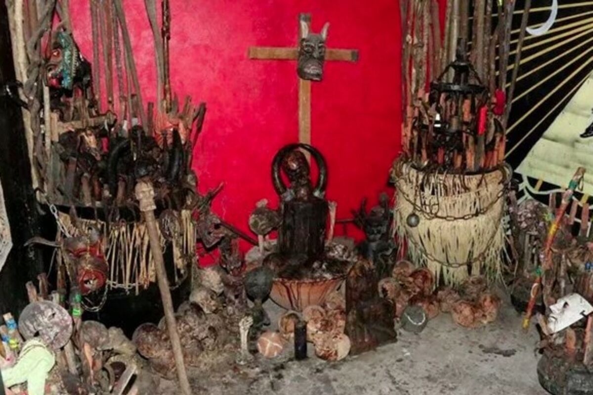 Na fotografiji koju je objavila kancelarija državnog tužioca u Siudad de Meksiku vide se lobanje grupisane oko oltara s krstom ukrašenim drvenom maskom za lice u obliku roga.