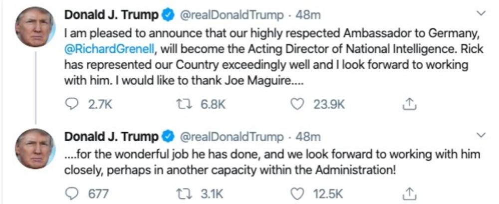 Američki predsednik Donald Tramp postavio je dosadašnjeg ambasadora SAD u Nemačkoj Ričarda Grenela na čelo svih obaveštajnih službi.