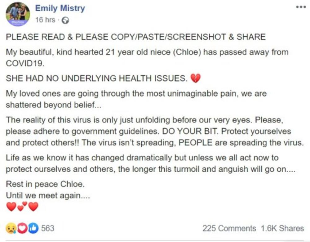 Porodica Kloi Midlton podelila je vest na Fejsbuku u nadi da će to biti upozorenje svima koji mere društvene distance ne shvataju dovoljno ozbiljno.