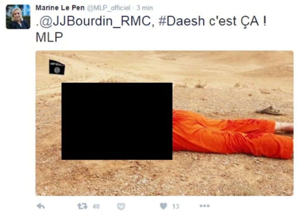 Na fotografijama je bilo telo Džejmsa Folija, kojem su islamisti odrubili glavu avgusta 2014. Njegova porodica je tada izjavila da je duboko uznemirena što ga je Le Penova iskoristila za političke ciljeve.