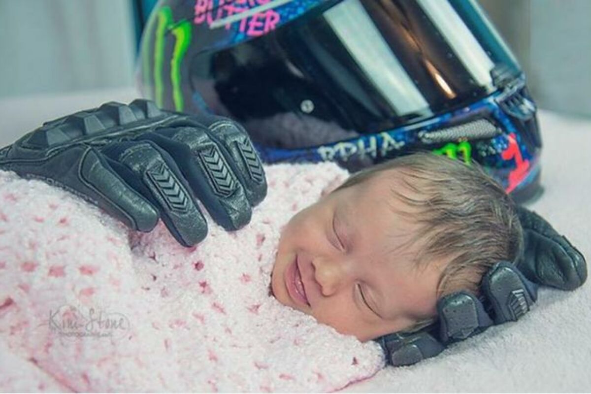 stare tri nedelje koja se smeši, prigrljena motociklističkim rukavicama pored