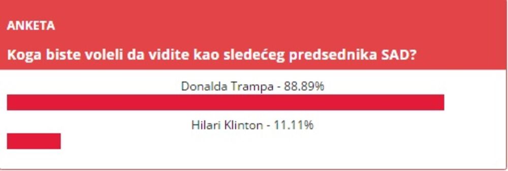 No, to nije jedino što smo vas pitali:Donalda TrampaHilari Klintonfoto: APTramp je najizgledniji kandidat republikanaca za predsednika SAD, koji, iako izaziva brojne kontroverze, i ljuti Amerikance svojim izjavama, kod Srba, izgleda, nailazi na simpatije.foto: EspresoSrbijePri tom, ona je jedan od najvećih zagovarača kosovske nezavisnosti.foto: AP/ReutersTramp, s druge strane, nema negativne konotacije u svesti naših građana, a to što nema političke repove definitivno mu ide na ruku.Rusijom.foto: Reuters / Chris Tilley