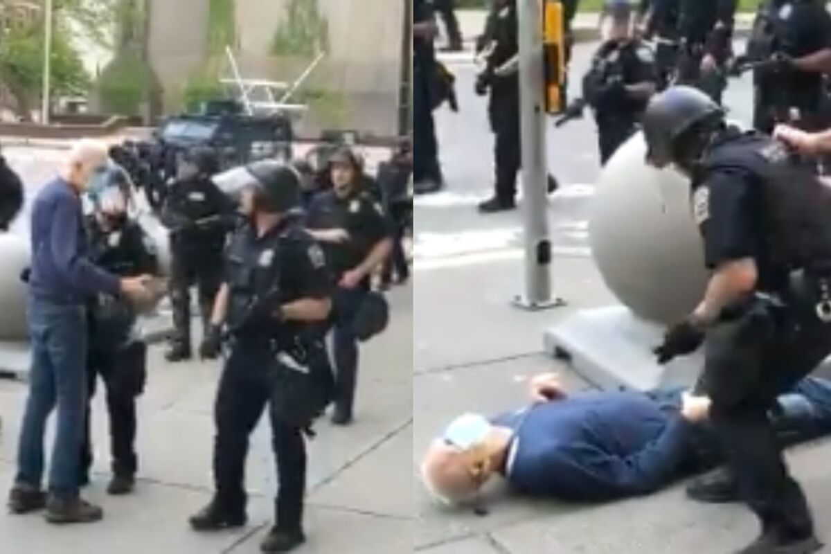 Na zastrašujućem video snimku zabeleženo je kako su policajci u Bufalu gurnuli na zemlju starijeg demonstranta dok su raščišćavali područje posle policijskog časa. Čovek je ležao nepomično na zemlji dok mu je tekla krv iz uha.