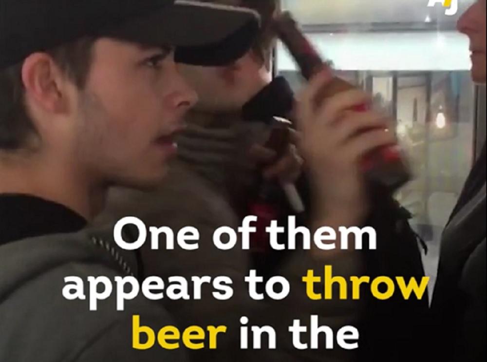 Nakon toga jedan od momaka je prosuo pivo čoveku lice, a ostali su uspeli da spreče veći incident. Nakon što se to dogodilo. pored niza uvreda, ljudi su počeli da im višu da su oni sramota za njihovu zemlju i da nisu dostojni Britanije.
