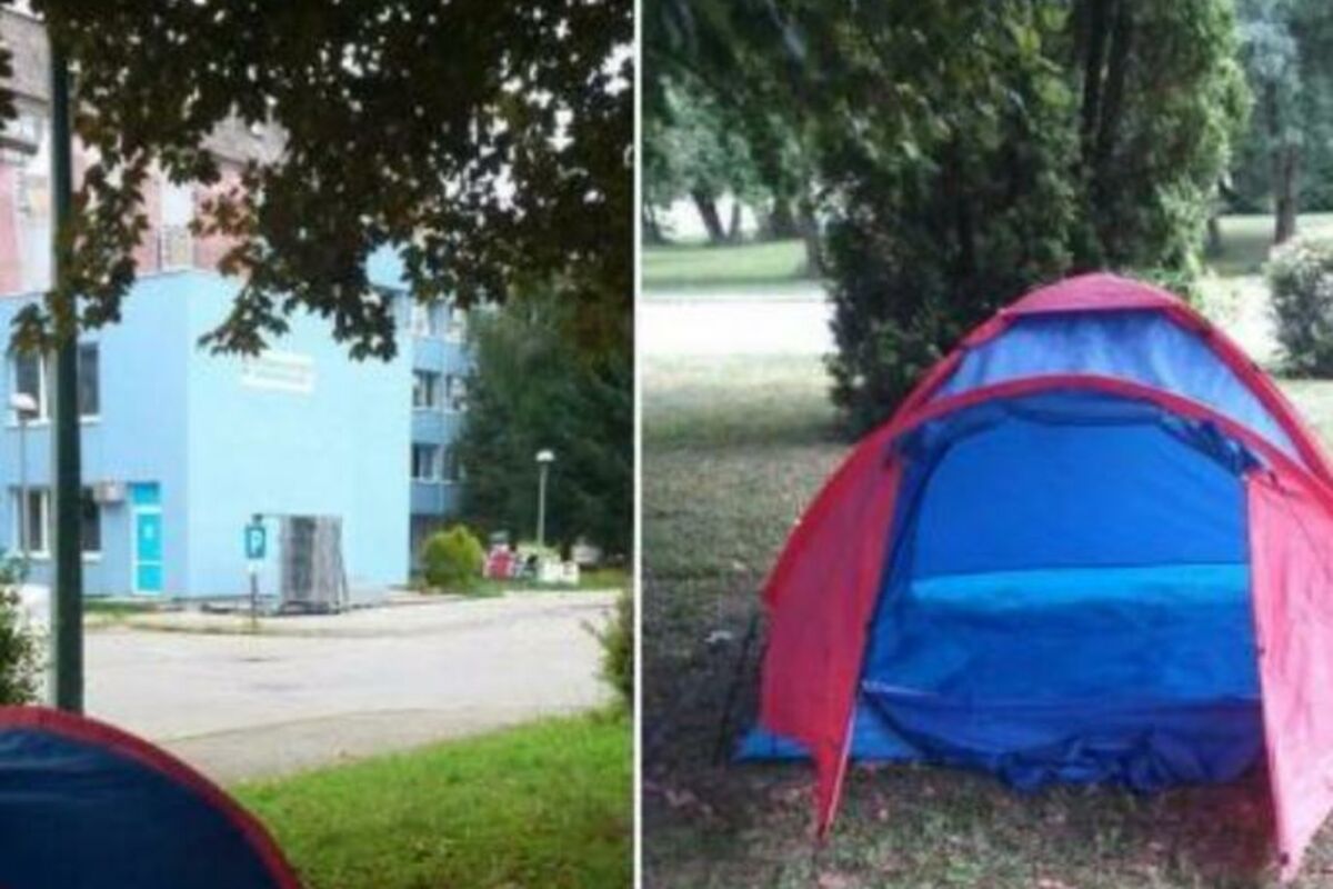 Roberto Mateš iz Pakraca je tata sedmogodišnjeg Šimuna koji je hospitalizovan usled infekcije korona virusom. Budući da ima pravo na posetu u trajanju od svega par minuta, ovaj tata je ispred bolnice razapeo šator kako bi mogao da putem toki-vokija bude na vezi sa sinom.
