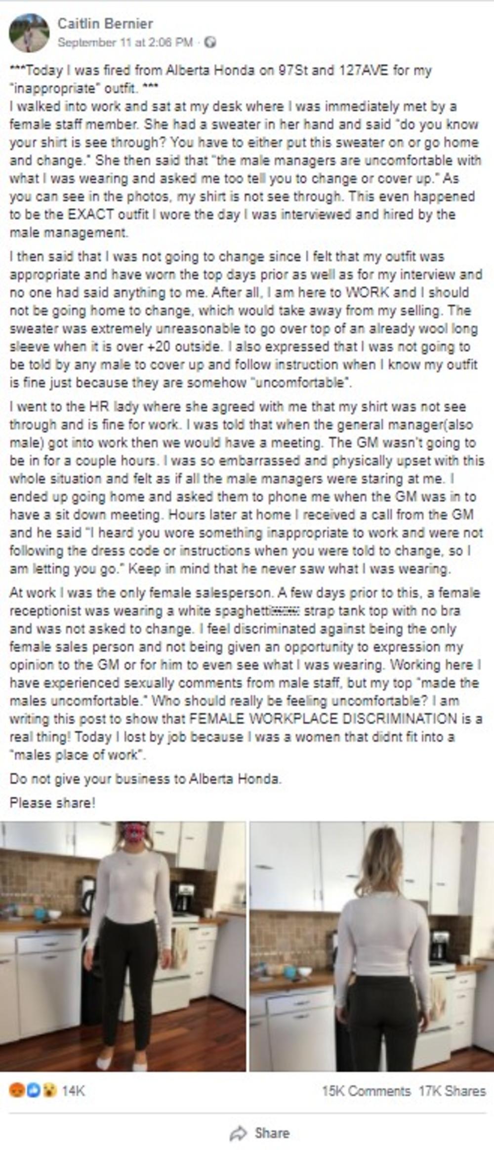 Žena koja je radila u salonu "Honde" u Edmontonu u Kanadi je otpuštena zbog bluze koju je nosila - a mnogi su nakon njene objave na Fejsbuku preispitivali odluku poslodavca.
