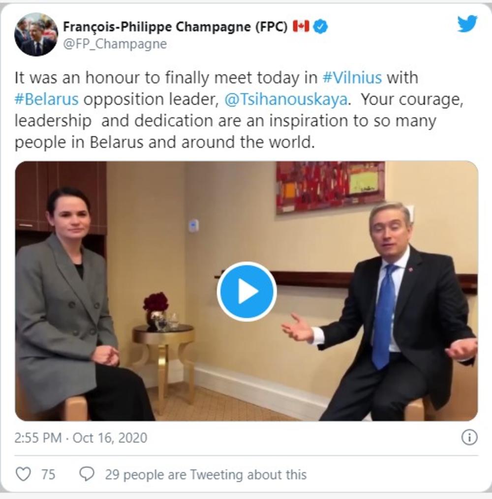 Kanadski ministar spoljnih poslova,Filip Šampanj, sastao se danas sa beloruskom opozicionarkom Svetlanom Tihanovskom koja je trenutno u emigraciji u Litvaniji.