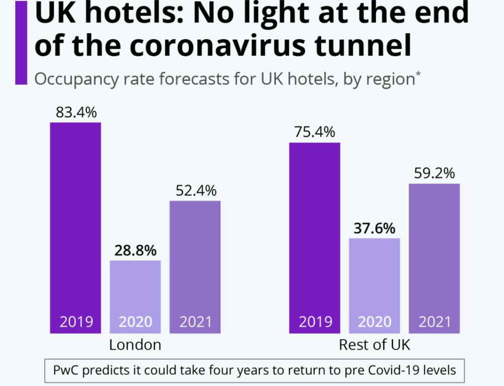 Posmatrajući stope hotelske popunjenosti Londona i ostatka Velike Britanije, očekuje se da će one u 2020. godini pasti sa 83-75 na samo 38-29 odsto. Takođe, uzimajući u obzir najavu vakcinacije stanovništva u drugom kvartalu 2021. godine, predviđa se da se oporavak hotela najverovatnije neće dogoditi do sledeće godine.