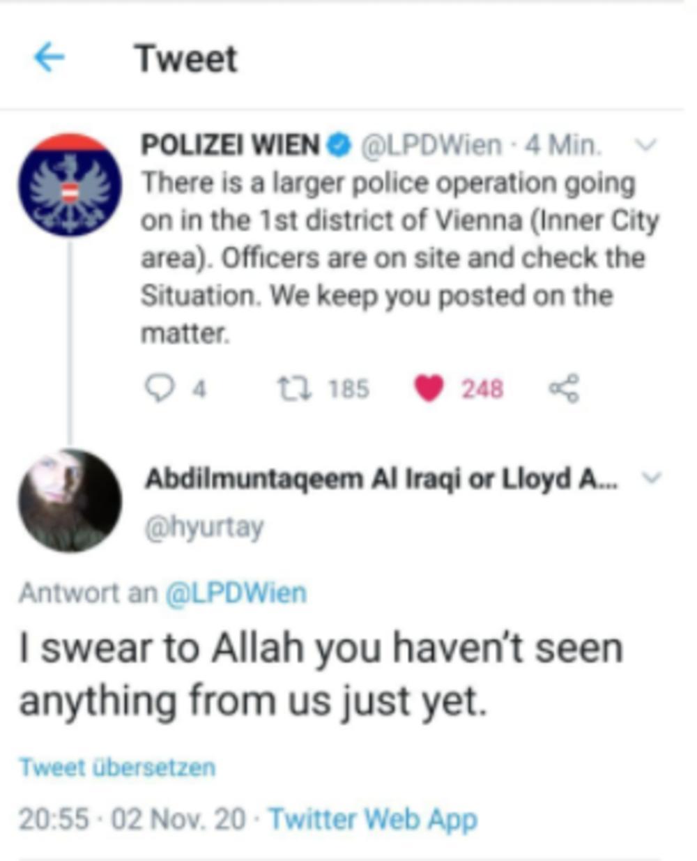 Na zvaničnom Tviter nalogu bečke policije već u prvim minutima pojavila su se i pretnje.