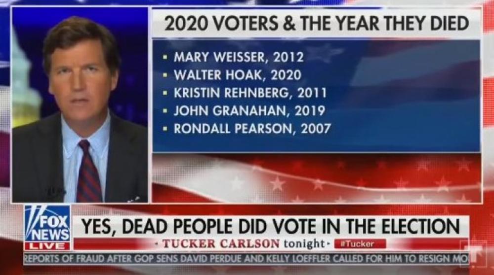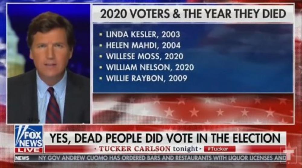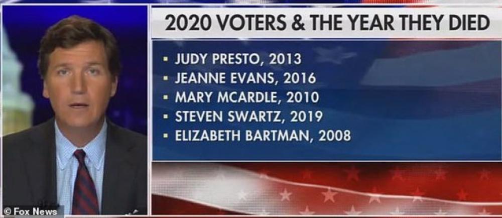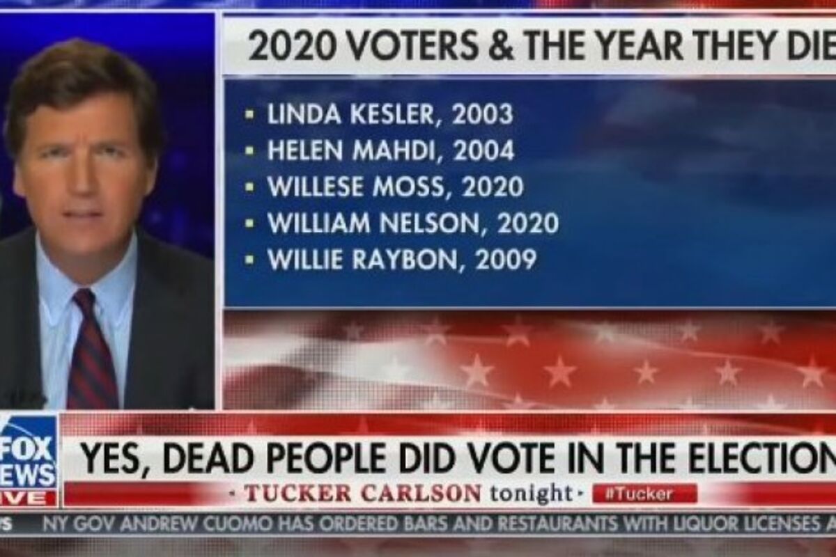 Taker Karlson, američki novinar i konzervativni politički komentator, imenovao je mrtve ljude za koje kaže da su "glasali" na izborima u SAD.
