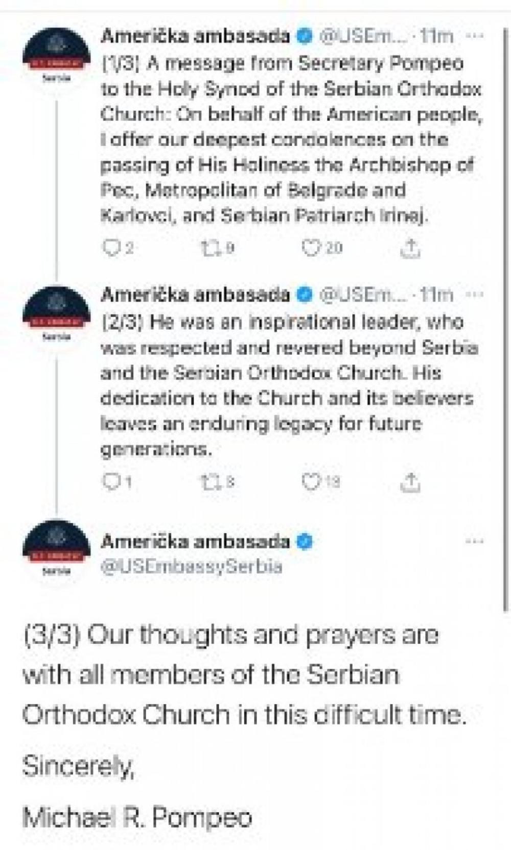 Pompeo izjavio saučešće zbog smrti koja je najviše potresla srbiju, odlaska našeg Irineja kog je nazvao inspirativnim vođom, poštovanim i cenjenim