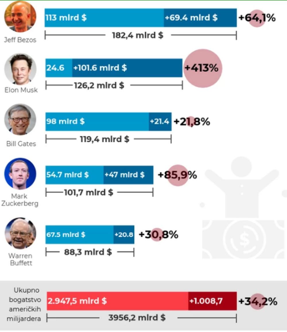Američki milijarderi su tokom pandemije značajno uvećali svoje bogatstvo. Analiza Čaka Kolinsa sa američkog Instituta za političke studije pokazala je da su američki milijarderi od marta ove godine bogatstvo povećali za 34 odsto – odnosno 1.000 milijardi dolara.