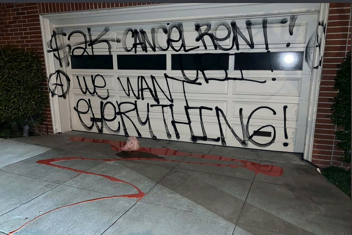 Lažna krv i nekoliko svinjskih glava su ostavljeni ispred kuće Pelosi u Kaliforniji, koja je ižvrljana grafitima, preneo je BBC.