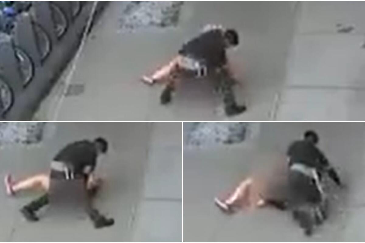 Naime, na snimku se može videti kako muškarac prati ženu, sustiže je i baca je na pločnik.