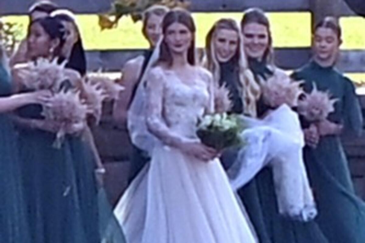 Mlada je nosila venčanicu dizajnerke Vere Vang, a devet deveruša bilo je odeveno u tamno zelene haljine pa su se, sudeći po fotografijama, sjajno zabavljale pozirajući fotografima.