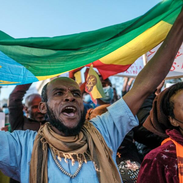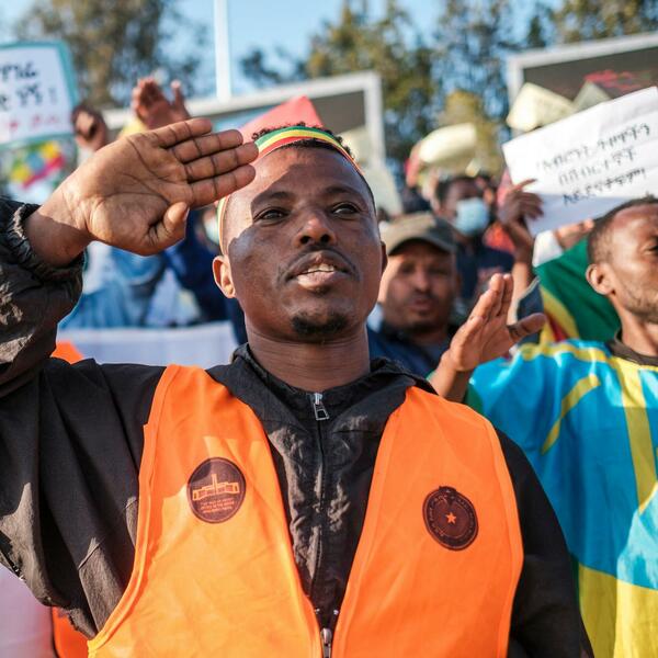 Učesnici protesta bili su ogrnuti zastavama Etiopije, a mnogi su zahtevali da se druge države ne mešaju u unutrašnje stvari te zemlje