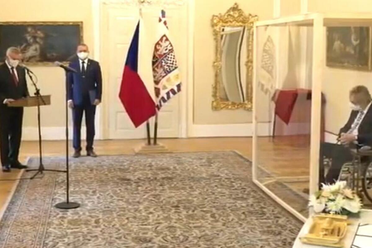 Češki predsednik Miloš Zeman zvanično je imenovao Petra Fijalu za novog premijera države u nedelju, a to je uradio sedeći u kolicima unutar kutije od pleksiglasa, praćen medicinskim radnicima obučenim u zaštitna odela od glave do pete.