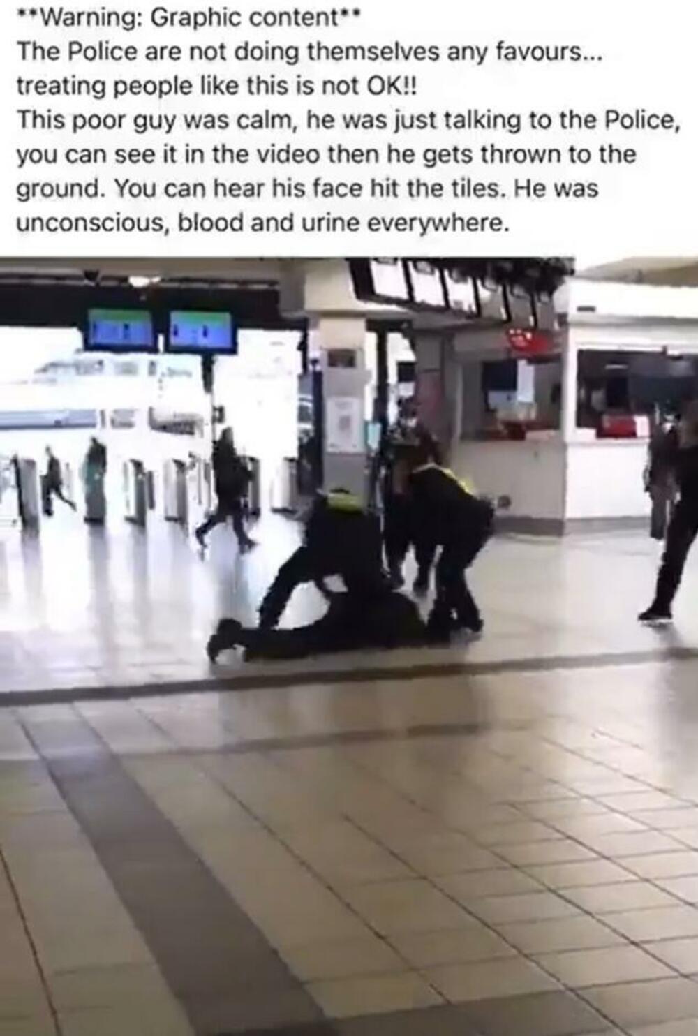 Na jednom od snimaka koji kruže društvenim mrežama evidentno je kako policajac prilazi čoveku s leđa i baca ga na pod pri čemu čovek ostaje bez svesti.
