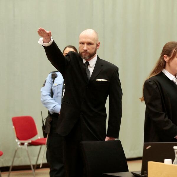 Obrijane glave i obučen u tamno odelo, Brejvik je prstima napravio znak bele rase pre nego što je podigao desnu ruku u nacistički pozdrav da bi signalizirao svoju krajnje desničarsku ideologiju kada je ušao u sud. Takođe je nosio natpise, štampane na engleskom, uključujući i jedan na kome je pisalo "Zaustavite svoj genocid nad našim belim nacijama" i "Nacistički građanski rat".
