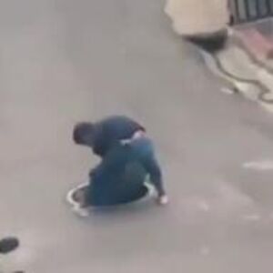 Na snimku se vidi kako jedan muškarac pokušava da spreči ženu u toj nameri, ali ona ispušta dete.