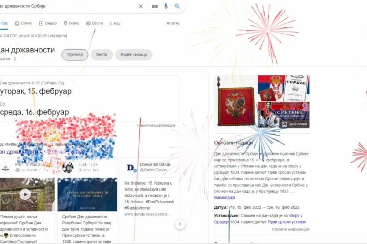 I kompanija Gugl danas slavi Dan državnosti Srbije. Na Google.rs domenu, na početnoj stranici vijori se zastava Srbije iznad natpisa ovog tehnološkog giganta.