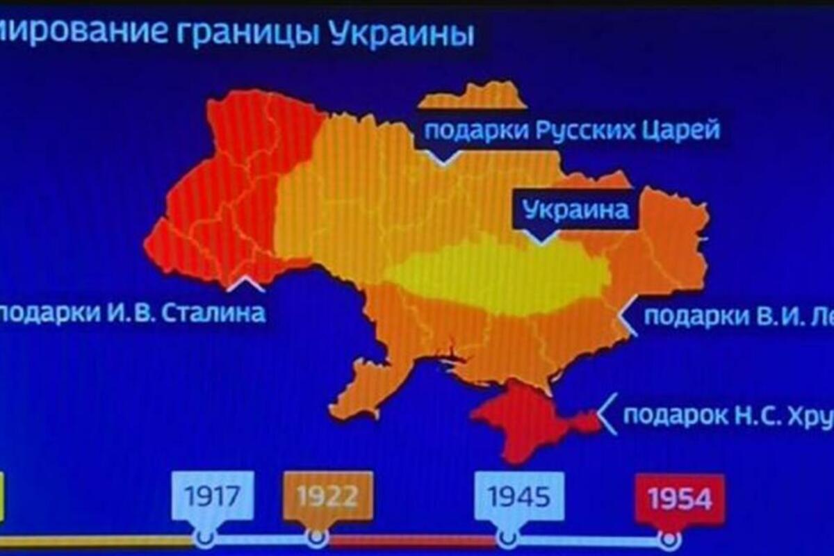 Naime, na karti je žutom bojom označena "prava" Ukrajina, dok su ostali delovi označeni kao "pokloni" koje su Josif Staljin, Vladimir Iljič Lenjin i Nikita Hruščov dali Ukrajini.